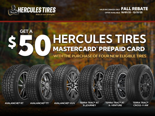 Canadian residents who purchase four qualifying passenger or light truck tires between 10/1/2025 and 12/31/2025 and submit online by 1/31/2026 may be eligible to receive up to a $50 Hercules Tires Mastercard* Prepaid card.